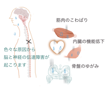 脳〜脊髄の神経伝達不良→筋肉のこわばり・関節可動域現象・骨の歪み・内臓の機能低下