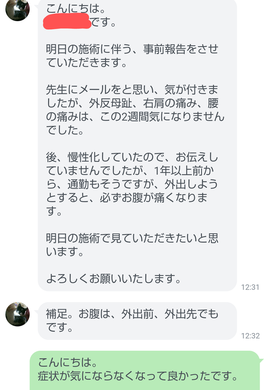 4回の施術により回復した感想を娘さんからLINEでいただきました。