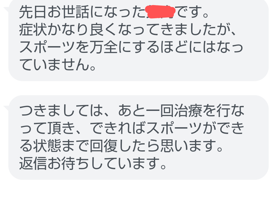 3回の施術でだいぶ緩和して、その後2回(計5回)の施術で痛みが完治しました。