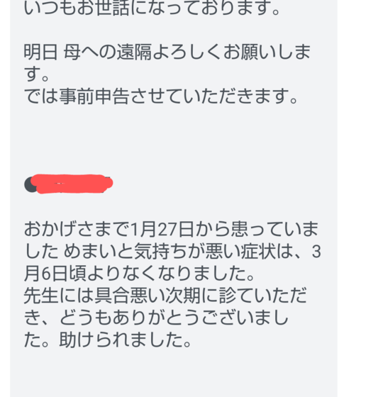 他県よりいつも遠隔整体をご利用いただいている方のお母様の目眩と気持ち悪さに対して遠隔整体を行いました。